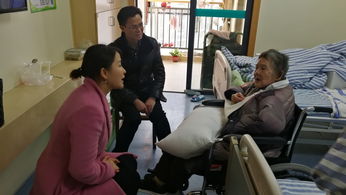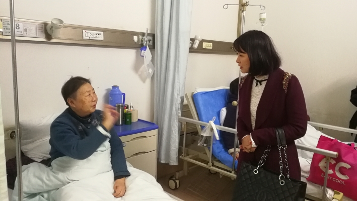 重点前往中医附二医院看望了黄聚福老人,91岁的老人家看到学校领导来看望她,心情可好了,兴高采烈的她拿着易茜主席的手,介绍自己的身体情况。